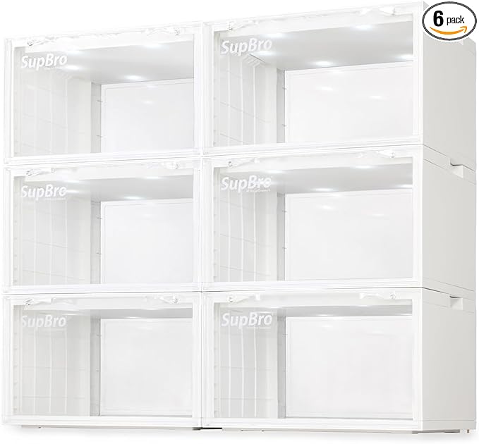 SupBro Led Collection Crate - Voice Control - Easy Access Storage Shoes box, Stackable Shoe Storage with clear plastic door for sneakers (11.2 x 14.9 x 8.8 inch (6pack), White)