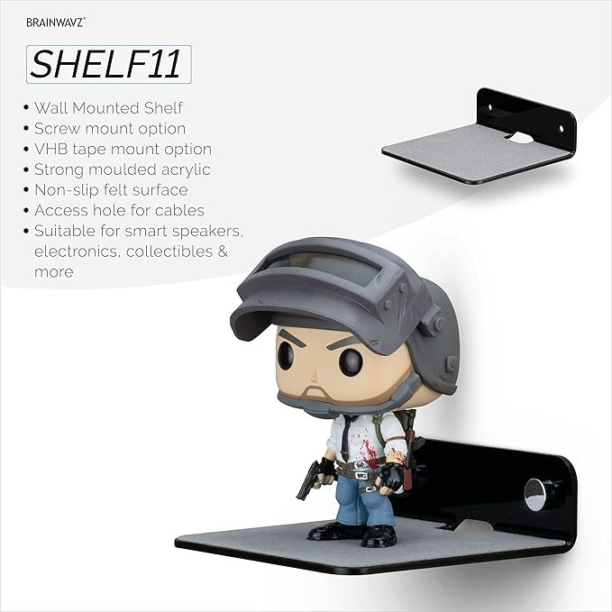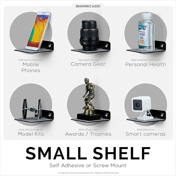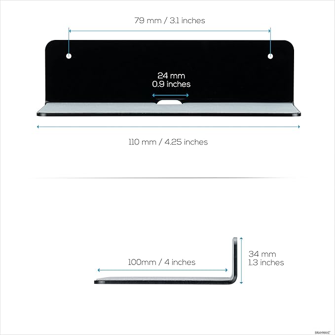 - SELF ADHESIVE MOUNT OPTION: Brainwavz floating shelves are simple to hang with no tools or screws required. We use only the best 3M VHB tape to mount the shelves on a variety of surfaces. Just peel off the red backing from the 3M VHB tape, affix our wall mount in the desired location, let it set for a few hours and you’re ready to go. DO NOT PLACE ON PAINTED, DAMP OR PLASTERED WALLS, THESE ARE NOT SUITABLE SURFACES FOR ADHESIVE MOUNTING!