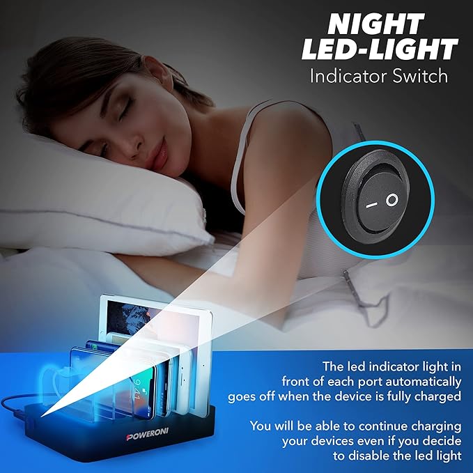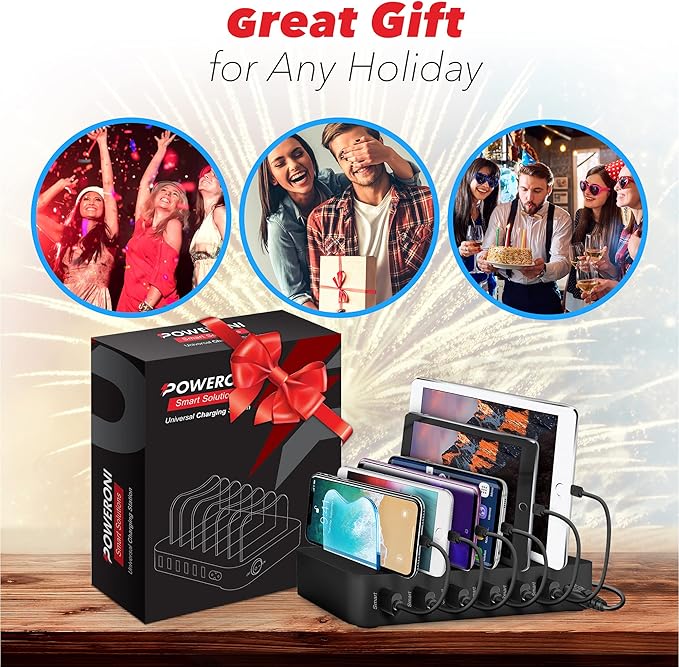 - Poweroni 6-Port USB Charging Dock: The Poweroni charging station is compatible with Apple, iPad, iPhone, Android, Samsung, and more, supporting charging cables like AP USB, micro-USB, and USB type C