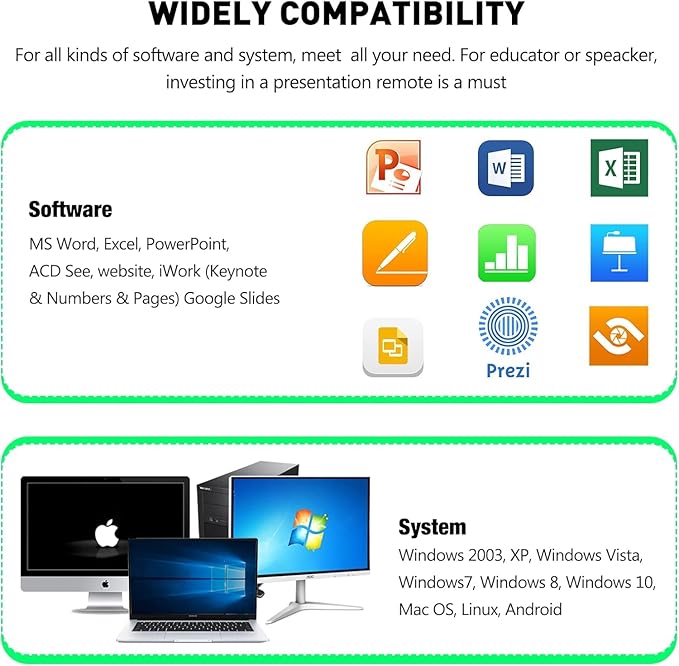 - 【Plug & Play PowerPoint Clicker with Laser Pointer】With 2 IN 1 USB and Type C receiver, Just Plug & Play, no need to install software; Clicker for laptop presentations supports Systems: Windows 2003 / XP / Vista / 7 / 8 / 10, Mac OS, Linux, Android; Supports Software: PowerPoint, Google Slides, Keynote, Prezi, PDF, MS Word, ACD See etc. Computer clicker for presentations supports devices: Macbook air, Macbook pro, Surface pro, PC, Computer etc