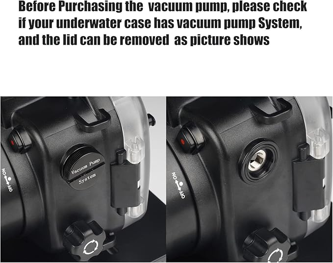 - The vacuum pump system is used for checking the water tightness of underwater camera housing before submerging or using when diving / snorkeling above 40 meters