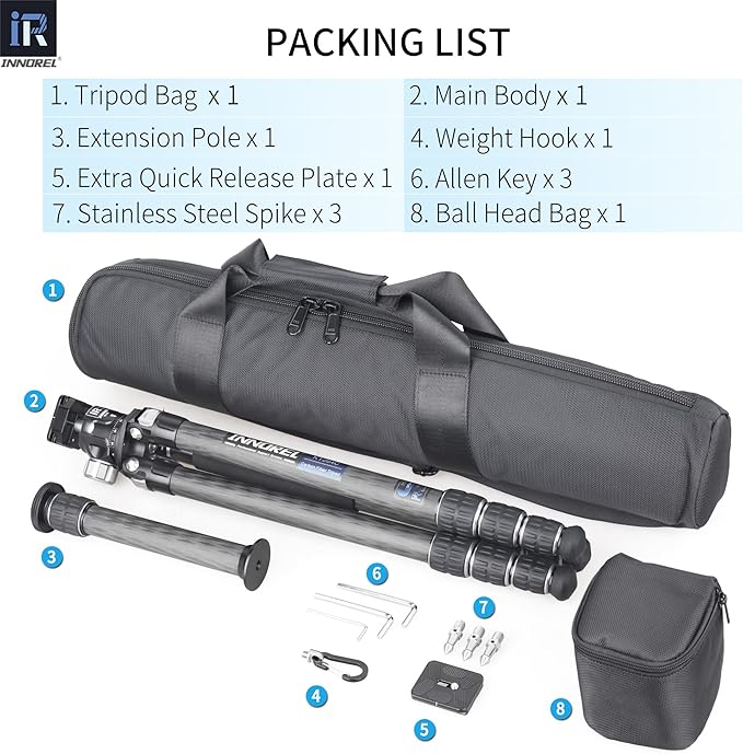 - 【PACKAGE】There is a tripod bag,a tripod carton,KT284C+N36,a center column,a hook,an extra quick release plate,three allen keys,three stainless steel spikes and a ball head bag in the package. Please contact us if you need any help in any time.