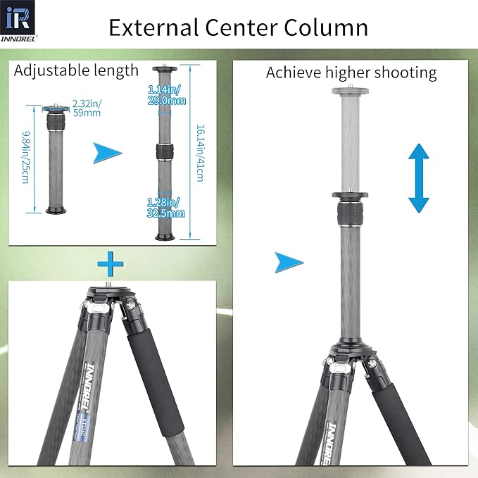 - 【2-SECTION ADJUSTABLE CENTER COLUMN】There is an external 2-section adjustable central column coming with the tirpod,after installing it, you can get an extra height of 16.14in/41cm, which can achieve higher shooting and match most photographer's need of shooting height.