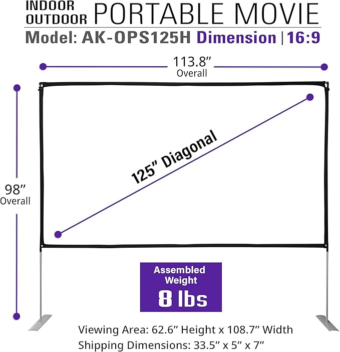 - 【QUALITY】Compatible with Ultra-short, Short, and Standard Throw projectors. Available in 125" diagonal size in 16:9 aspect ratio. Overall Size: 98" H x 113.8" W.