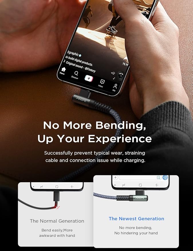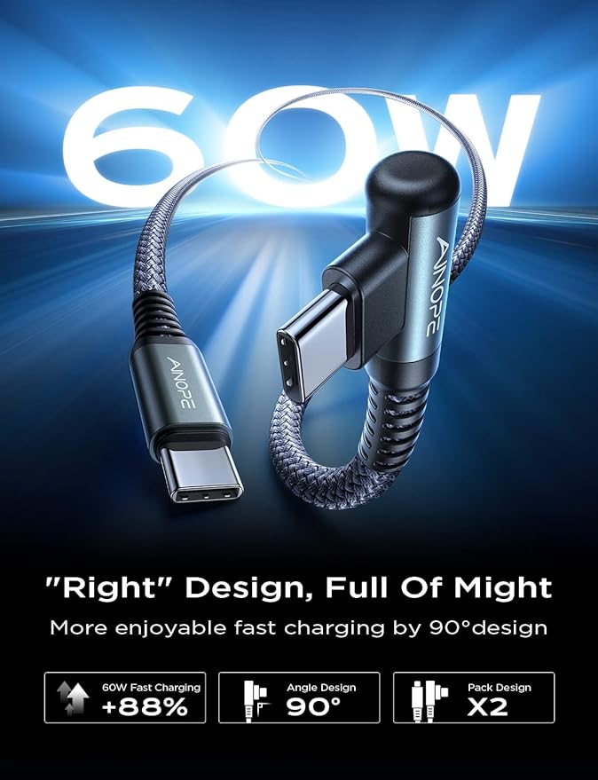 - ADVANCED RIGHT ANGLE DESIGN: Compared to conventional charging cables, this USB C to USB C cable features an ergonomic 90° Right Angle "L" design that may successfully prevent typical wear, straining cable and connection issues and increase the life of the charging cable. Its ergonomic design makes it easier and more comfortable to play games, use apps in portrait mode, watch videos, and read e-books while charging. Besides, it can be used in any cramped corner.