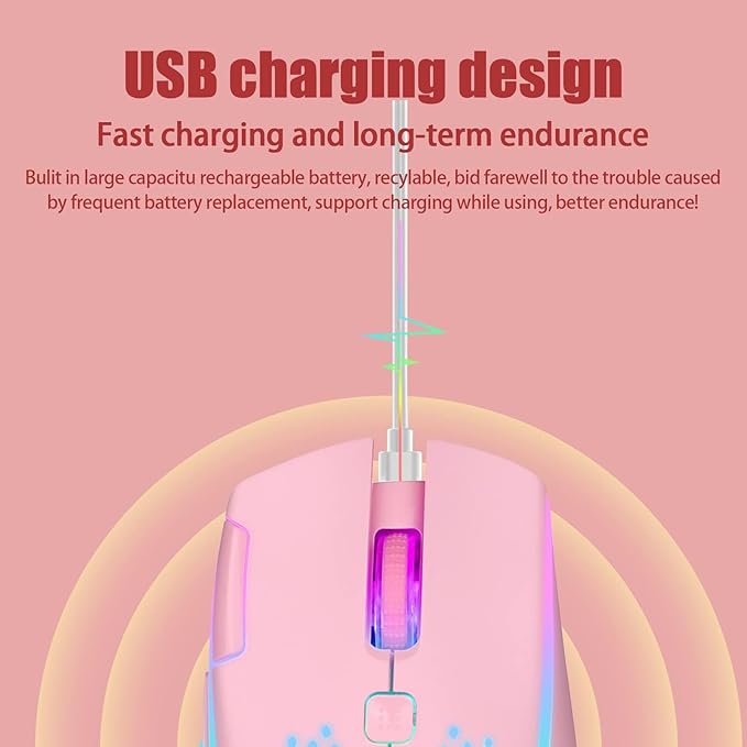 VEGCOO Wireless Gaming Mouse, C30 Silent Click Wireless Rechargeable Gaming Mouse with Double-Click Key and Colorful LED Lights, 3 Level Adjustable DPI for Gaming and Working (Pink)