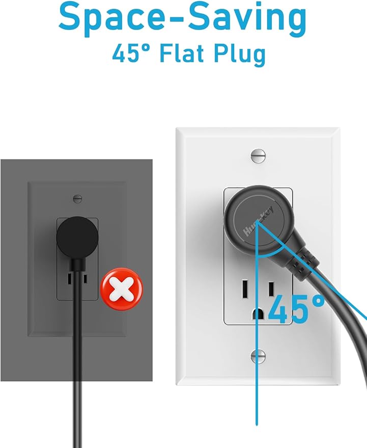 - Space-Saving Design for a Tidy Space🛡️ Say goodbye to outlet hogging! The unique low-profile angled plug stays flush to the wall, freeing up the second outlet. Plus, the strategic outlet spacing ensures no space is wasted, keeping your area clean and organized.