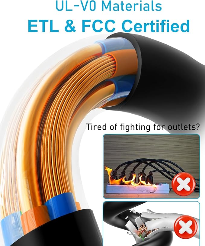 - Engineered for Safety & Peace of Mind🛡️ Your family's safety is non-negotiable. This strip features a flame-retardant shell (1380°F rated), an over-current protection switch to prevent overheating, and a heavy-duty 14AWG cord. It's ETL & FCC listed for guaranteed peace of mind.