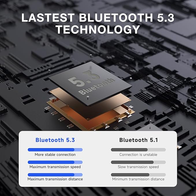 - [Advanced Bluetooth Technology] Our earbuds adopt Bluetooth 5.3 technology, which greatly improves the transmission speed and provides a low-latency listening experience. With support for A2DP, AVRCP, HFP, and more, you can enjoy seamless connectivity and superb audio quality.