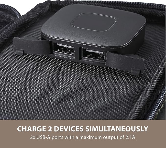 - IN THE BOX - Solar panel with built-in storage bag, USB-A to USB-C cable, setup manual.