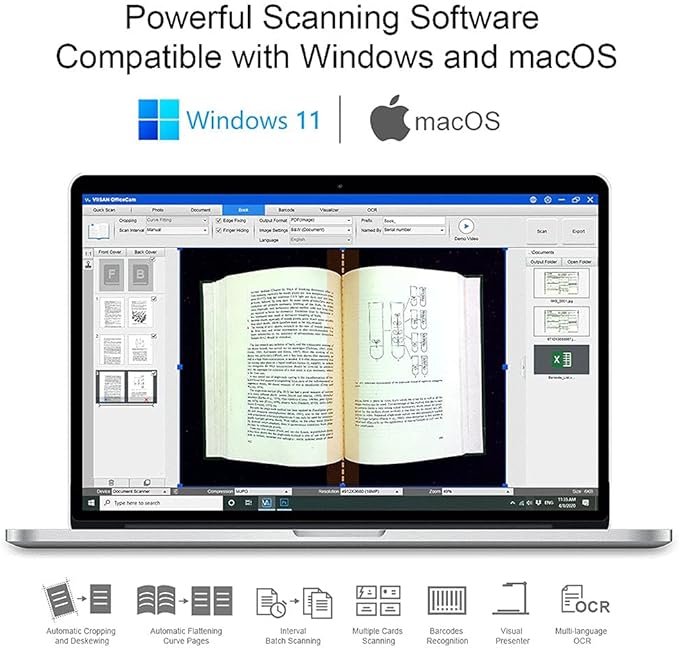 - [Intelligent Scanning Software] You can use the bundled VIISAN scanning software with the smart device to get great results while scanning books. For example, it can automatically digitally flattens curved pages, erases fingers from the scanned photos, repairs the damaged edges of documents, and automatically splits double-page into separate images. and the embedded OCR feature you can convert all the scanned files into PDF or editable Word/Excel/Epub/Txt files