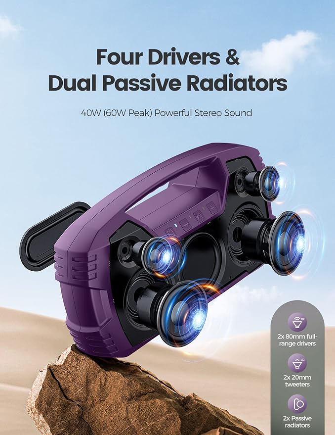 - Powerful Stereo Speaker - Featuring 4 dedicated drivers with 2 15W full-range drivers and 2 5W tweeters, along with 2 passive radiators on the front and rear, this loud Bluetooth speaker delivers 40W surround sound (peak 60W) and pumps out well-balanced midrange, crisp treble, and punchy bass with virtually no distortion, letting you enjoy the music to the utmost. Pair 2 speakers together for 80 watt stereo sound