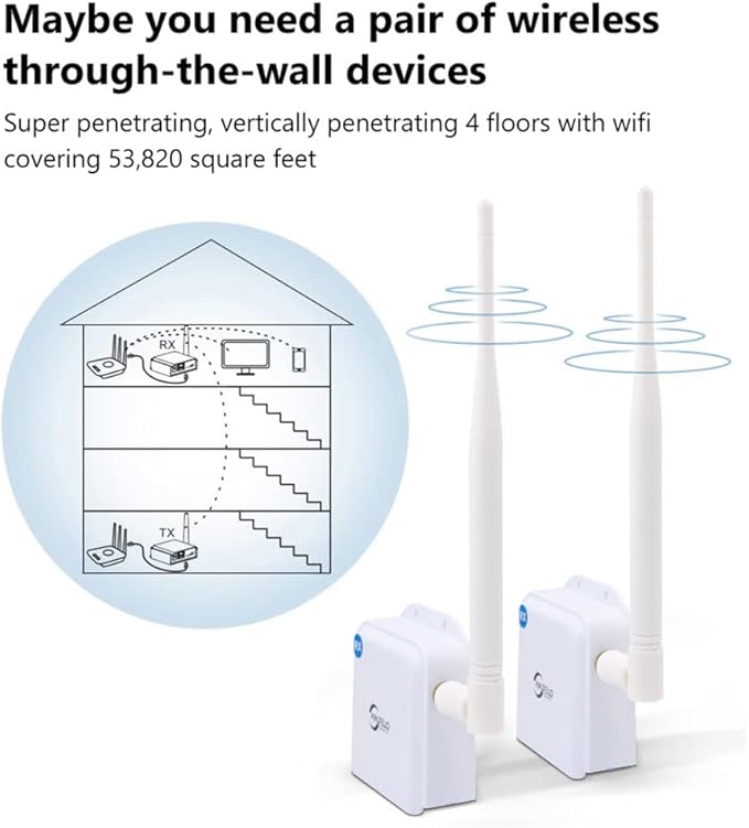 - Strong Signal Transmission:Connect one of the wireless bridges to the IP camera and the other to your computer for long distance monitoring without the need for long distance wiring or additional routers. Make long-distance wireless coverage, data transmission and wireless monitoring easy and professional. It meets many scenarios that require long-distance wireless transmission needs such as buildings, factories, farms, construction sites, warehouses, elevators, etc.