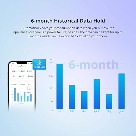 - 【6-Month Consumption History Data by Hour】 Power consumption data (accurate to hours) can be kept for up to 6 months which can be exported to excel on your phone.
