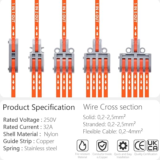 - ✔【PACKAGE CONTENT】XALXMAW Electrical connector kit package contains, 18pcs 1 in 1 out; 6pcs 1 in 2 out; 4pcs 1 in 3 out; 2pcs 1 in 4 out; 2pcs 1 in 5 out, a total of 32pcs DIY splicing connectors.