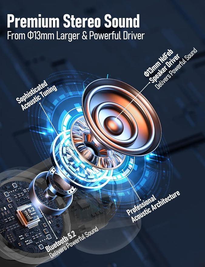 - High Quality Sound: Advanced Bluetooth 5.2 technology supports HSP/HFP/A2DP/ AVRCP with stereo sound. Ф13mm NdFeB Speaker, professional acoustic architecture and tuning, bring you with most natural and vivid sound.