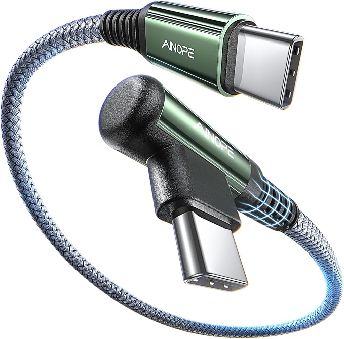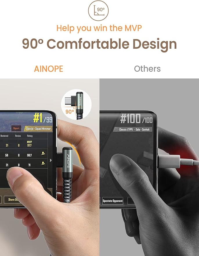 - ADVANCED RIGHT ANGLE DESIGN: Compared to conventional charging cables, this USB C to USB C cable features an ergonomic 90° Right Angle "L" design that may successfully prevent typical wear, straining cable and connection issues and increase the life of the charging cable. Its ergonomic design makes it easier and more comfortable to play games, use apps in portrait mode, watch videos, and read e-books while charging. Besides, it can be used in any cramped corner.