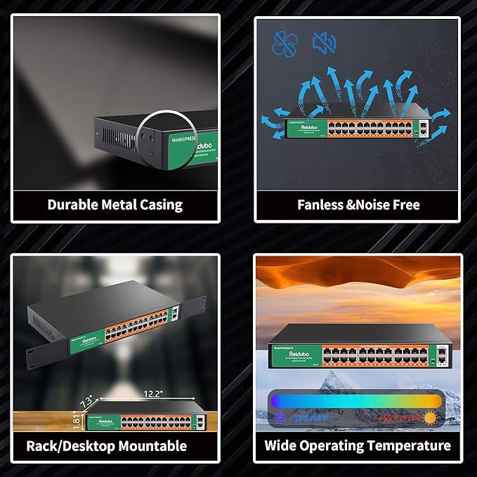 - 【Built-in Power Supply & 4KV Lightning protection】Reidubo 26-port gigabit PoE switch built-in power supply (400W). the power adapter is no more needed, which makes the PoE Switch simpler and lighter. Ideal for PoE Security Camera, Access Point, IP Phone, and other PD devices.4KV lightning protection design allows your products and devices to operate stably even in bad weather. Each port can intelligently detect the power required by the device. Normal output 15.4W, maximum output 30W