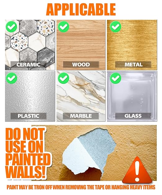 - ๐๐๐ฆ๐ฌ ๐ง๐ข ๐จ๐ฆ๐ - Paste tapes to the item, attach it to wherever you need, press and hold for 20 seconds, then all good! Our double-sided tape is compatible with smooth and flat surfaces, such as wood, metal, glass, plastic, marble, and ceramic. Due to the strong adhesion of our tape, DO NOT use it on painted wall or wallpaper since the cover may be torn off when removing the tape or hanging heavy items.