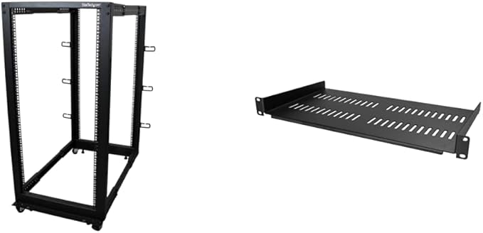 StarTech.com 4-Post 25U Mobile Open Frame Server Rack and 1U Server Rack Shelf Bundle