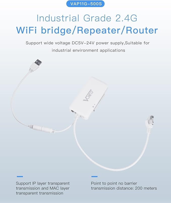 - 【2025 New Upgrade】 New Process Design, Super Stability. High Power Industrial Mini 2.4GHz WiFi Bridge/Router/Repeater/Wireless Access Point/WiFi to Ethernet RJ45, can achieve WiFi to Wired or Wired to WiFi function.Compared to the VAP11S, this one has an inbuilt antenna and is smaller, but still has a strong signal.