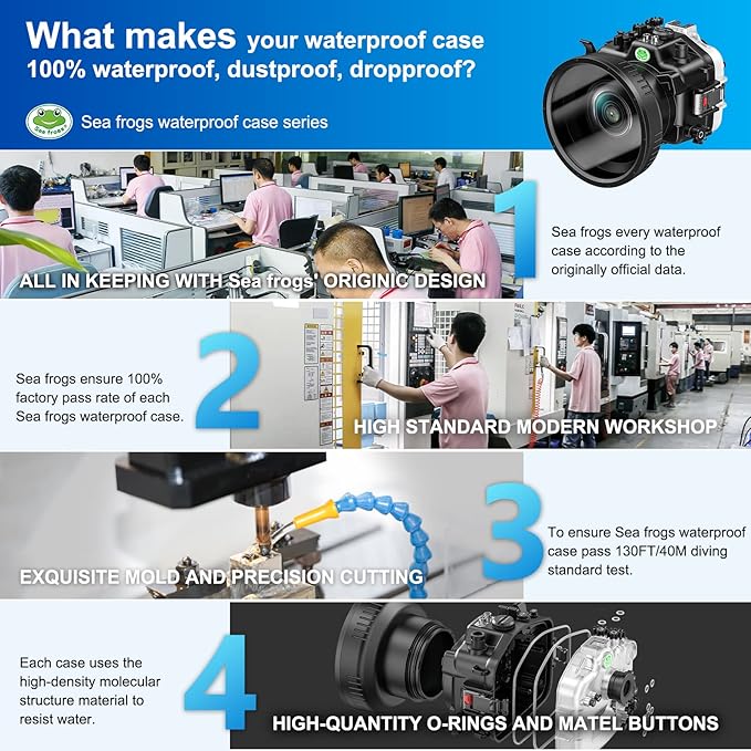 - · 【 Diving and Anti-Pressure 】 :The Sea Frogs diving case is up to 40 Meters (132feet) waterproof depth. IPX8 Certified Waterproof level. Before you dive into the water, please make a trial use on this item to make sure you know all the functions and the waterproof test.