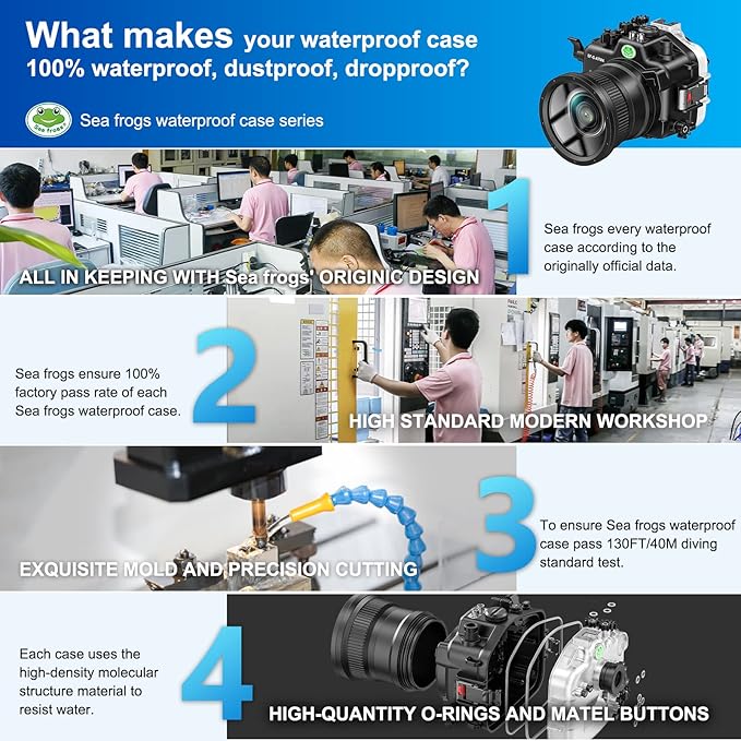 - · 【 Diving and Anti-Pressure 】 :The Sea Frogs diving case is up to 40 Meters (132feet) waterproof depth. IPX8 Certified Waterproof level. Before you dive into the water, please make a trial use on this item to make sure you know all the functions and the waterproof test.