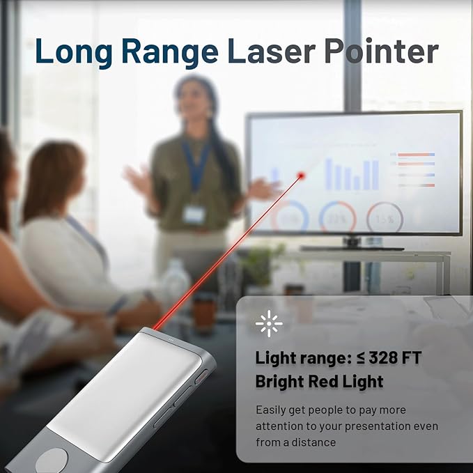 - 【Long Range Laser Pointer 】By pressing the Home Button, the presentation clicker can easily release an intense red laser to attract more attention to your presentations and lectures. (Light range: ≤ 328 FT).