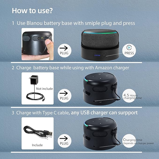 - 【Packing List & Note】Blanou battery holder for Dot 3rd *1, user manual *1. Note: We do not provide additional power adapters for D3.Please use original adapter that comes with Dot to charge