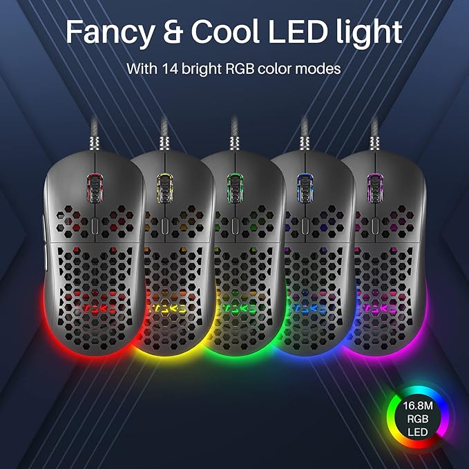 - 75g Ultra-Lightweight Design: The honeycomb structure on the top and bottom of this gaming mouse significantly reduces its overall weight. The unique hollow design prevents excessive sweating during prolonged use. Additionally, the ultra-flexible braided cable is so lightweight that it provides a drag-free wireless feel.