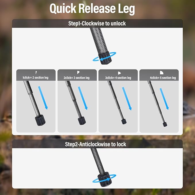 - INNOVATIVE QUICK-RELEASE LEG SYSTEM: Say goodbye to multiple twist locks! The SIRUI Traveler X features a single twist lock mechanism that allows you to fully extend or retract its 5-section legs in just 2 seconds. This innovative design saves time, helping you capture every shooting or hunting moment with ease.