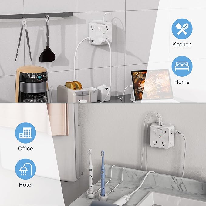 - Widely Space Outlet: 3-side design AC outlets with 1.65-inch long space in between, can fit 8 big plugs together without blocking, saving your home space; Makes it easier to use various equipment in any place with limited sockets, especially in kitchen, living room
