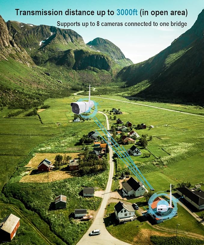 - 【Point to Point Connection for Wireless Extension】This wireless bridge camera set support point-to-point, point-to-multipoint modes to extend camera monitoring range. Such as lane monitoring, elevator monitoring,extedng the network in the house to your backyard, garden,barn,street,etc. Wireless bridge point-to-point, supports up to 8 cameras. No need to insall a new modem.