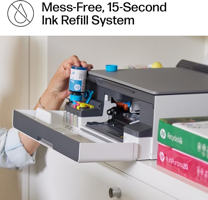- MESS-FREE REFILL – Replenish ink with HP's easy-access, mess-free refill system. Simply plug the ink bottles into the ink tank and let them drain—no squeezing, no spilling