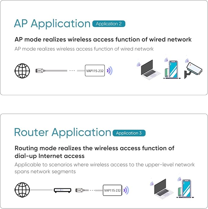 - 【Multiple Application Methods】WiFi Signal Repeater: can extend WiFi transmission distance; WiFi Bridge: IP layer transparent transmission, MAC layer transparent transmission; Router Mode: support WiFi WAN uplink and WAN/LAN exchange. Perfect for Network/Medical/IoT devices, Network Printer, PLC, robot, monitor, DVR, IP camera, Video transmission, POS Cash Register, PS3, and more applications