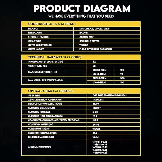 - π Duplex Configuration: This cable features a duplex design, allowing for simultaneous bidirectional data transfer, ideal for networking applications. Made of Corning glass with OS2 9/125 single mode for enhanced signal integrity and minimal signal loss over long distances.