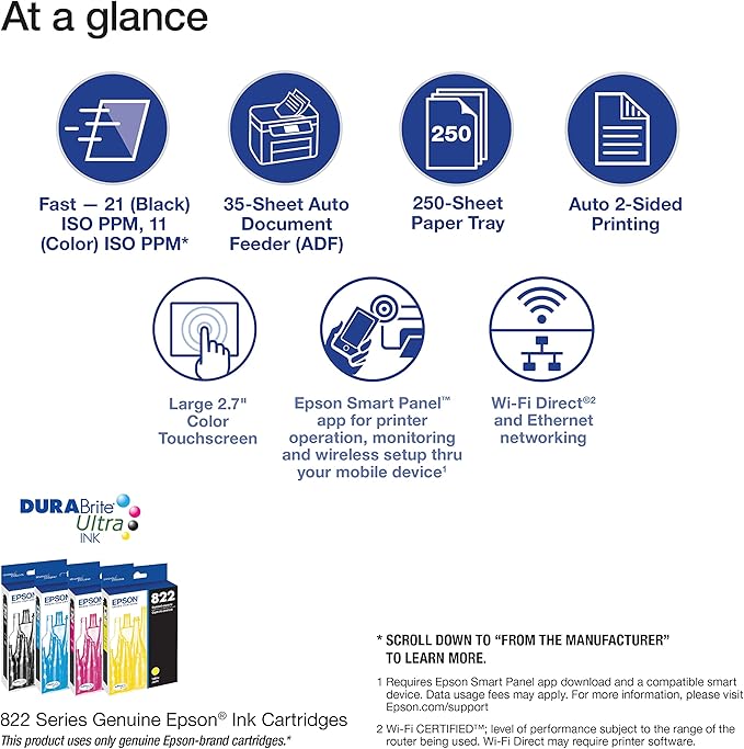 - Easy to use — 2.7" color touchscreen for quick navigation and control, plus all-new Epson Smart Panel app (1) for enhanced connectivity and productivity from your mobile device