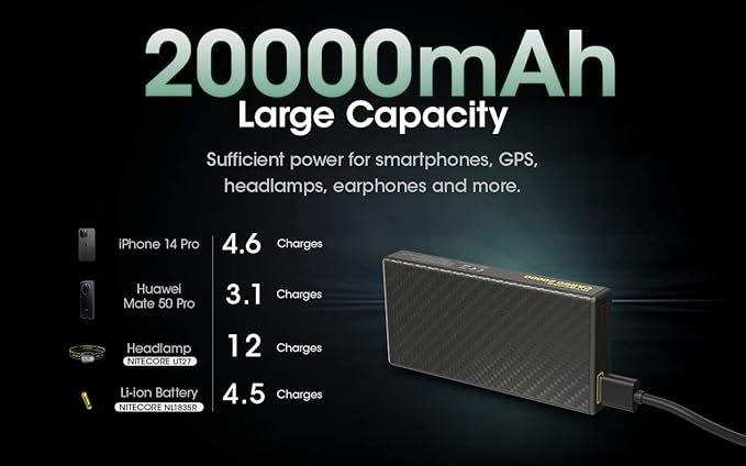 - Content: NITECORE Carbo 20000 rechargeable power bank, USB-C and micro USB cords