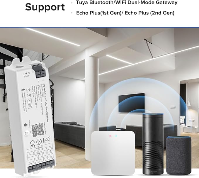 - 【Support Echo Plus,Echo(4th Gen) and Home-Kit Gateway】Support Echo Plus,Echo(4th Gen),Home-Kit.Compatible with general Zigbee bridge.More stable and convenient connection with Zigbee Gateway.Work with Tuya Bluetooth/WiFi Dual-Mode Gateway,it can Support Third Part Voice Control like Alexa,Google Home.Package content: 1X LED controller, 1X User manual.Can't support Smart-Things.
