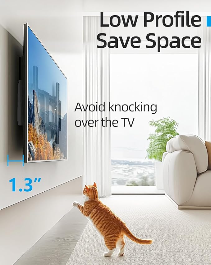 - 4. Low Profile Design: The mount keeps the TV close to the wall, giving a sleek and clean look. It only extends about 1.3 inches from the wall, tilts -9° to reduce glare, which is great for a modern setup.