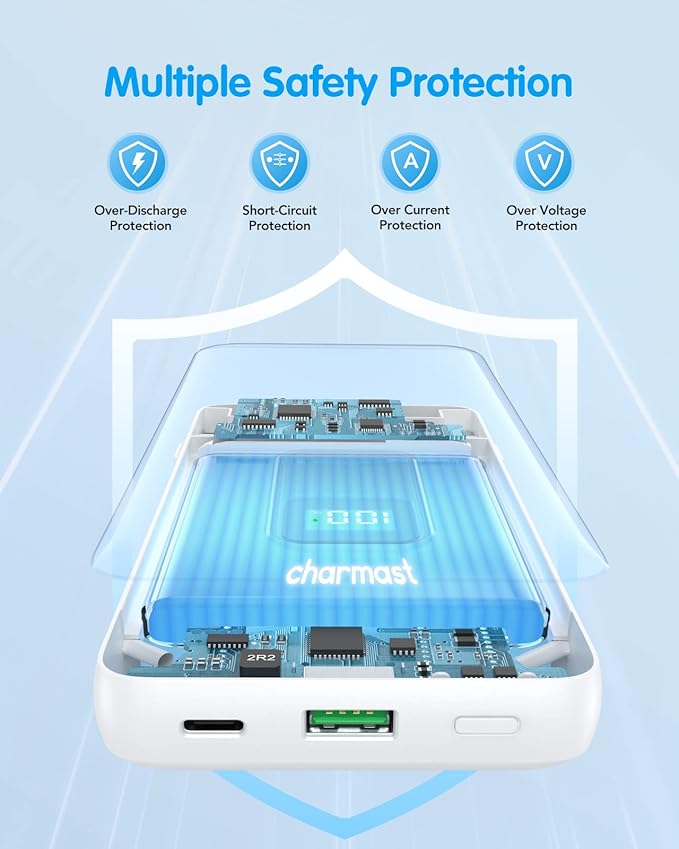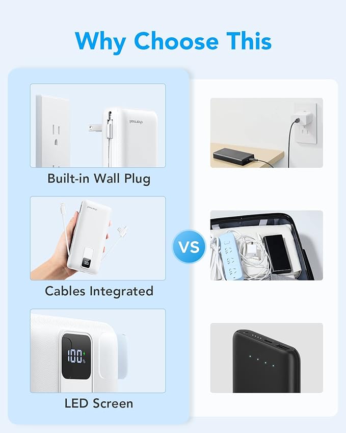 - Portable Charger with Built-in Cables and Wall Plug: Two cords and wall plugs integrated allows the Charmast power bank to be compatible with all cellphones, so you don't need to bring extra chargers or get frustrated with a tangled mess of wires.