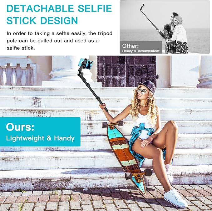 - [Multifunctional Selfie Stick Tripod ] Tall Tripod with Remote Control allows you to take photos or videos easily even far away from your phone or camera. Compatible with both iphone and Android phones. Phone stand tripod with universal 1/4" screw can be connect with most cameras, action cameras and camcorders