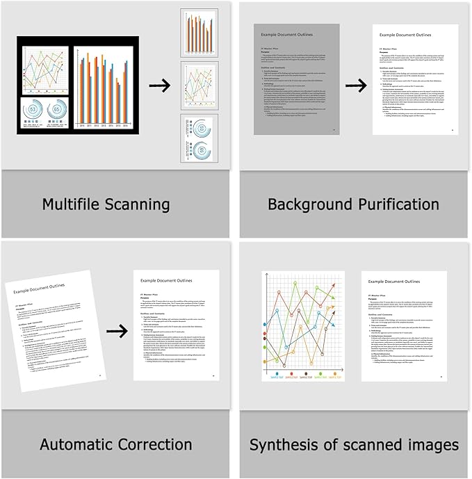 - ➤Smart and Easy Scanning - This document scanner has a one-key automatic correction feature that intelligently fixes skewed images in seconds. It also supports mass automatic scanning, word, pdf, and text formats, and improves your work efficiency with only manual page turning.