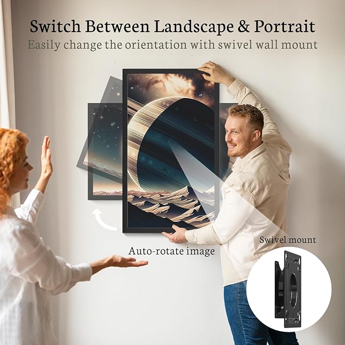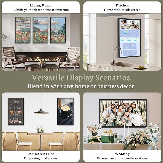 - Apply to Any Scenes: Wall-mounted design makes it can be easily rotated when mounted on the wall for better viewing experience, you can enjoy the lifelike images like standing in a gallery with art painting decoration. This portaretrato digital can find applications in a variety of scenarios such as offices, restaurants, hotels, exhibitions and more. It can also display family photos in the living room, products in the office, events in shops, menus in restaurants and more. With its sleep mode function, you can conveniently schedule the digital photo album and switch it off to enhance convenience of your daily life. It's perfect for life and work.