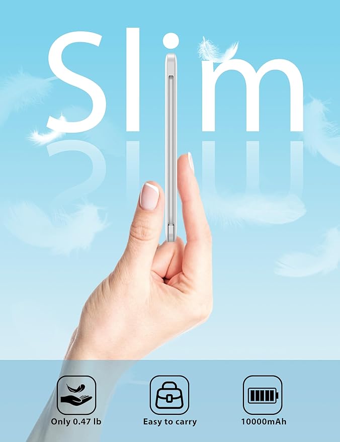 - High Capacity: Contains 10000mAh of power. Enough to provide over 2 entire replacement charge for iPhone 16, for iPhone 15 and Samsung Galaxy S24. 10000mAh can meet your daily electricity demand. And its body is slim, 5.59*2.75*0.57inch like a little phone that you can carry it in your handbag. It will be your most important partner daily. And when you are traveling or on a business trip that will be helpful