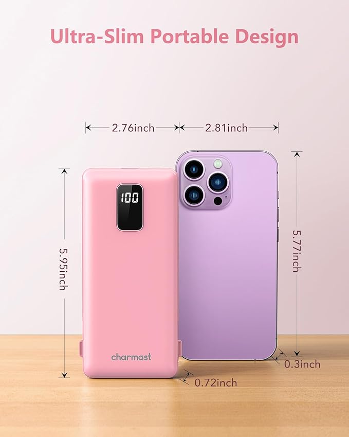 - Slim Compact Design: The portable charger weighs about 8 ounces, 5.95" x 2.76" x 0.72" slim design fits comfortably in the palm or pocket.