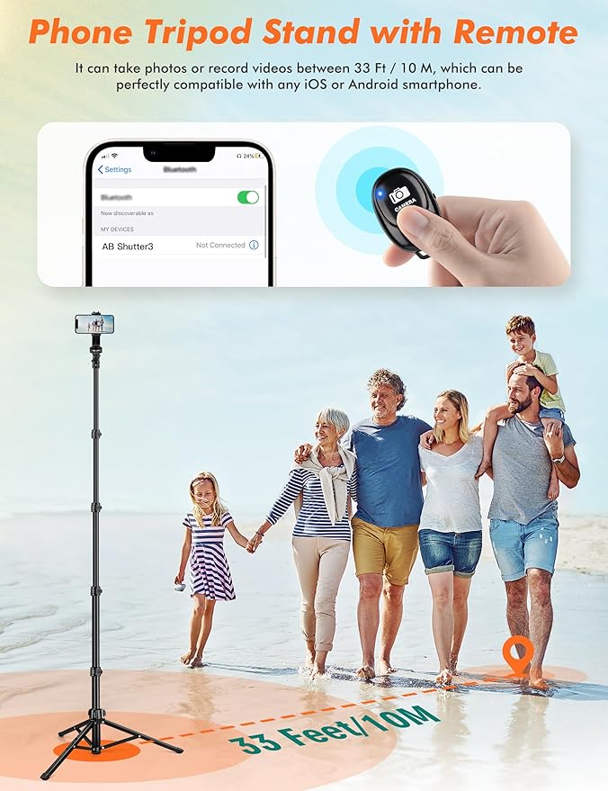 - Selfie Stick Tripod with Remote: Cellphone tripod selfie stick suitable for taking photos. A built-in wireless remote, compatible with iOS or Android easily controls phone camera from a distance of 33 ft /10 m, giving you more flexibility and creativity.