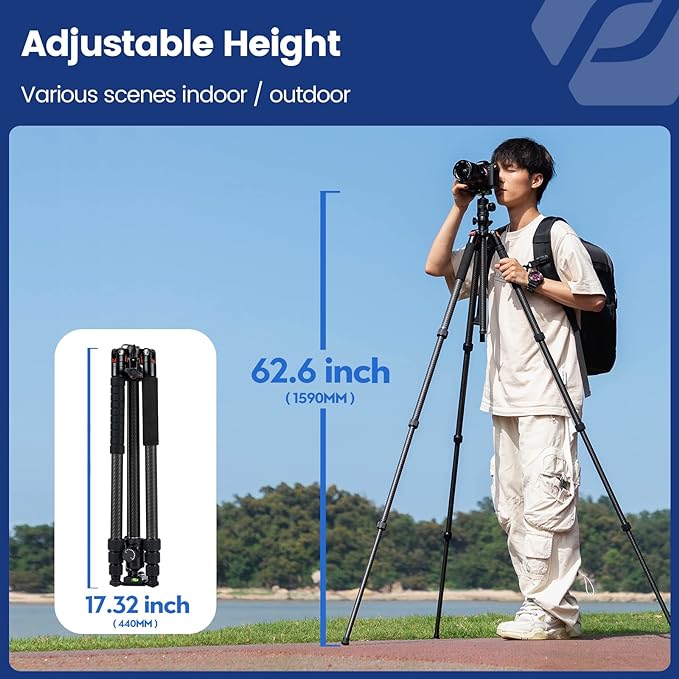 - Ideal Travel Tripod: This compact carbon tripod is also a travel tripod, can be folded for storage, folded height of 17.32 inches / 44 cm, weighs only 3lbs / 1.36kg, can be easily put into the bag when travelling. It has 4-section carbon fiber legs that easily adjust from 4.6inches/11.6CM to 63inches/160cm in height, which is sufficient for most shots.