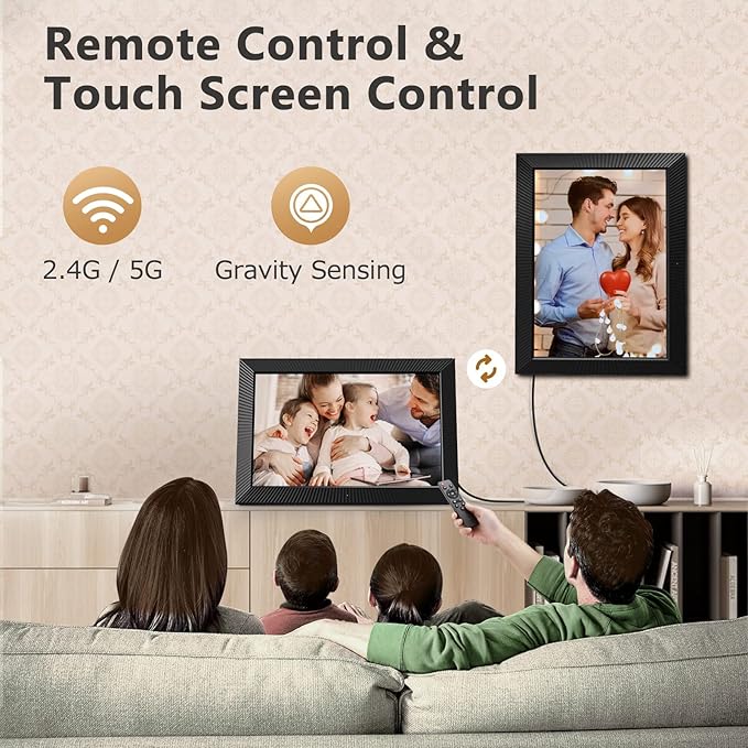 - [Easy to Use] The smart digital picture frame adopts a wall-mount design, you can choose to place it on the table or hang it on the wall according to your preference. In addition, the gravity-sensing auto-rotation feature allows photos to adjust directions in portrait or landscape orientation to fit the digital picture frame as you like. It is convenient for the elderly.