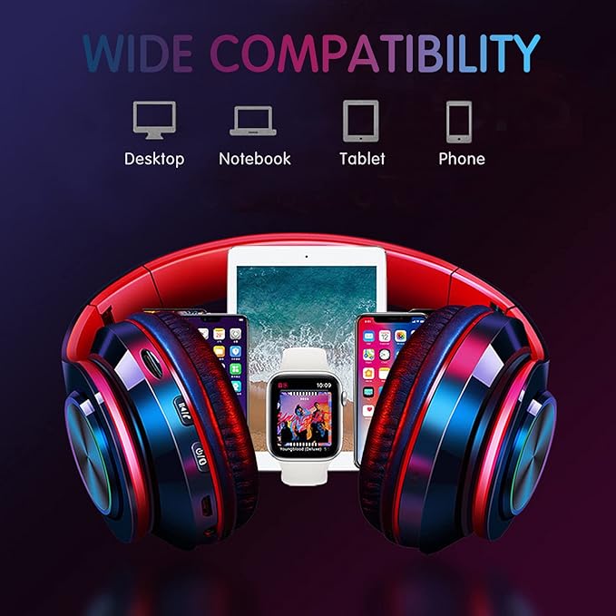 Bluetooth Wireless Over Ear Headphones, HiFi Stereo Sound Foldable Headset,Colorful LED Lights Headphones with Built-in Mic,Wired for School/Tablet Computer/PC/TV/Cellphones/Travel (Black Red)
